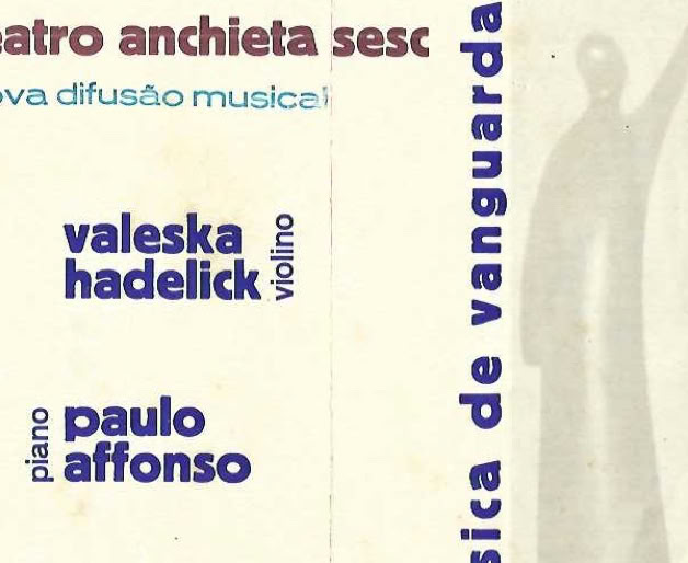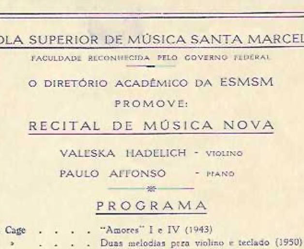 The presence of contemporary music in higher music studies was pioneered by a concert organized by Paulo Affonso de Moura Ferreira in collaboration with Nova Difusão, promoted by the Academic Board of the Santa Marcelina Music Faculty. The New Music Recital held on October 2nd by Valeska Hadelich and Paulo Affonso consisted of compositions by John Cage, Anton Webern, Krzysztof Penderecki, Jan Klusak, Kazimierz Serecki, and the Brazilian composers Almeida Prado, Gilberto Mendes, Joaquim Thomás Jayme, Ernst Mahle, and Breno Blauth.