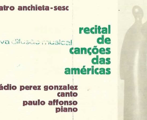 Two concerts held at the Teatro Anchieta SESC, organized by Paulo Affonso de Moura Ferreira in collaboration with Nova Difusão, marked ND's studies in August 1969. The avant-garde music concert, conducted by Valeska Radelich and Paulo Affonso, consisted of compositions by J. Cage, A. Webern, K. Penderecki, F. Liszt (Bagatelle without tonality), K. Serecki, F. Evangelisti, L. de Pablo, N. Kokron, R. Komorous, J. Luciuk, and the Brazilians Almeida Prado and Gilberto Mendes. A landmark for the renewal of perspectives on inter-Americanism in music and musicology was the recital of songs from the Americas by Eládio Perez Gonzalez and Paulo Affonso, held in collaboration with ND on August 20th. The program included compositions by Alberto Ginastera (Argentina), Amadeo Roldan (Cuba), Ncolas Pérez-Gonzáles (Paraguay), Emilio Bigi (Paraguay), Aaron Copland (USA), Gerardo Guevara (Ecuador), Aantonio Estevez (Venezuela) and Silvestre Revueltas (Mexico), as well as by the Brazilian Jamary Oliveira.