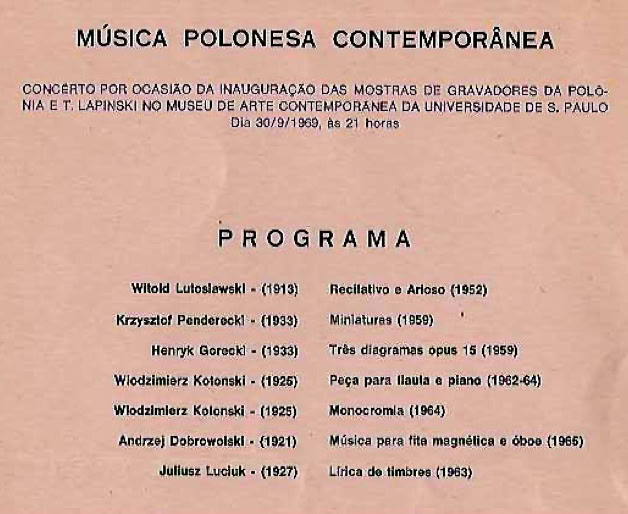 The year 1969 was marked by a special interest in the works of 20th-century Polish composers and the significance of Poland in contemporary musical creation, with particular consideration given to the Warsaw Autumn Festival. Contemporary Polish Music was a highly significant concert held on the occasion of the inauguration of exhibitions of Polish engravers and E. T. Lapinski at the Museum of Contemporary Art of USP on September 20th. The program, coordinated by Paulo Affonso de Moura Ferreira with the collaboration of the São Paulo Musical Youth and Nova Difusão, consisted of works by W. Lutoslawski, K. Penderecki, H. Gorecki, W. Kolonski, A. Dobrowolski, and J. Luckluk, performed by G. Busch, V. Hadelich, P. Affonso, and S. Masano. The event was marked by a lecture by Paulo Affonso that sparked debate and gave impetus to subsequent ND initiatives, in particular motivating the São Paulo Autumn Festival that would take place in 1970.